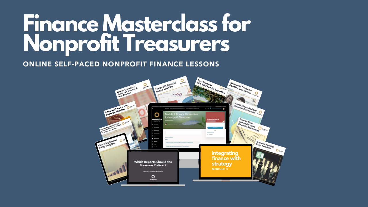 - Treasurer specific lessons PLUS the full Finance Masterclass for Nonprofit Leaders lessons and takeaway tools.