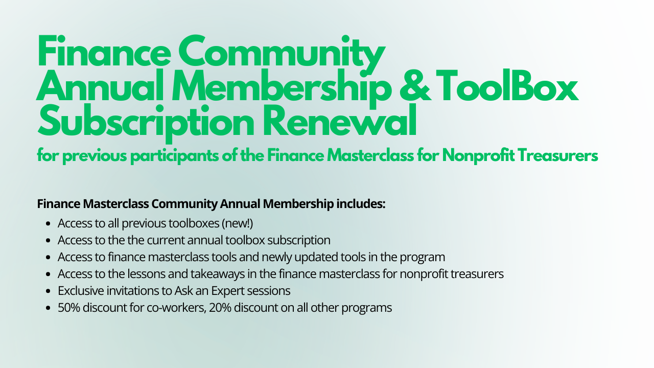 Only participants of the Finance Masterclass for Nonprofit Treasurers are eligible for this annual membership.